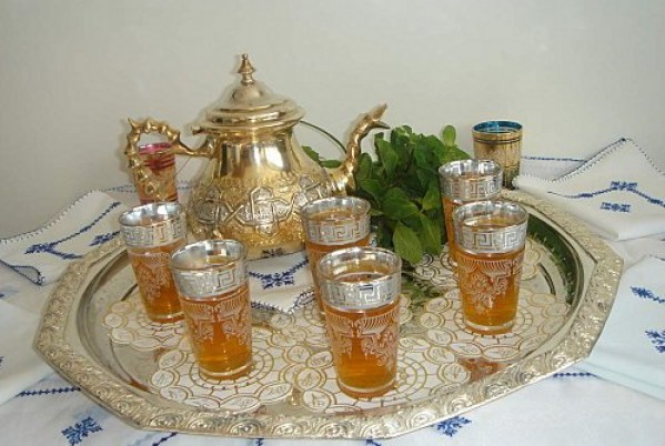 The tea is often served in ornately engraved silver tea pot, trays, and crystal glasses. Like in Russia, tea is prepared in a samovar but is usually made with gunpowder green tea, not black tea. After brewing, the tea is heavily sweetened with sugar and flavoured with a touch of mint. To serve, the teapot is held high in the air while being poured.