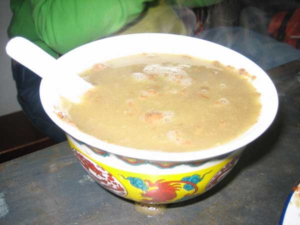 Po cha or Tibean Butter tea consists of salt, yak butter and a smoky type of black tea. The tea comes as brick and a bit is crumbled into water and boiled for hours to create a bitter brew chaku. This is then stored. To make Po cha some of the chaku is poured into a wooden cylindrical churn called a chandong, along with yak butter and salt, then churned together for a couple of minutes before serving. Po Cha is consumed several times a day. It believed it have health benefits like providing energy, keeping warm and protecting the lips from cracking.